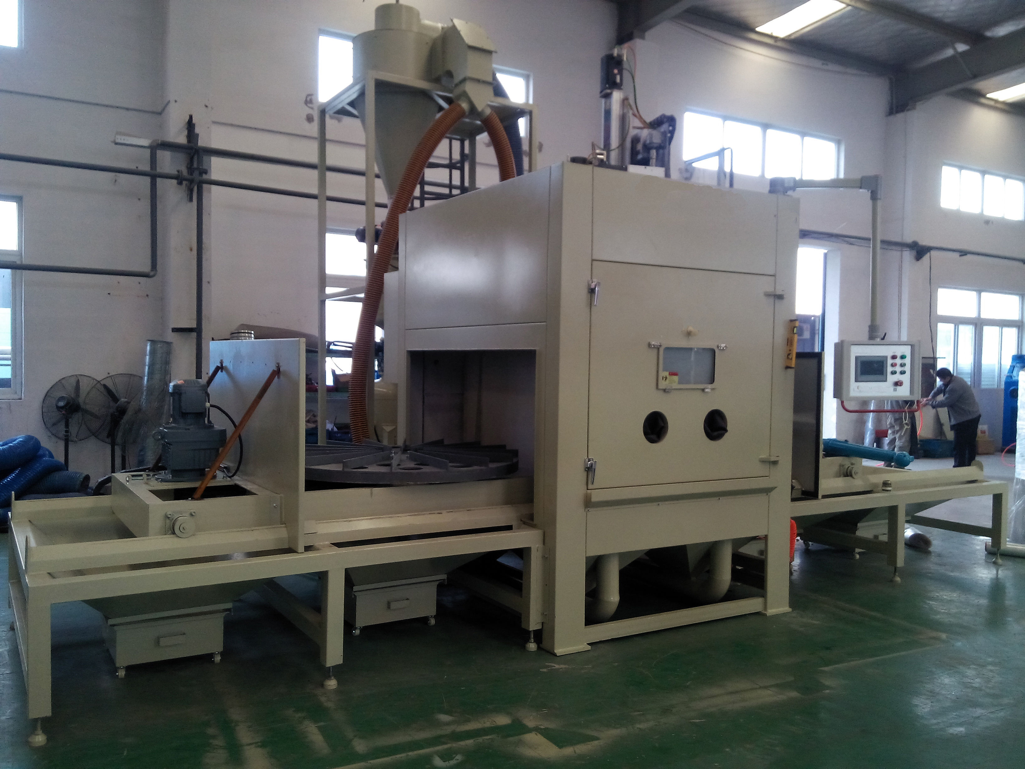 6、 吹凈完畢,臺車轉盤退出并取下工件,另端轉盤工件進入,如此循環,完成間歇式噴砂加工。